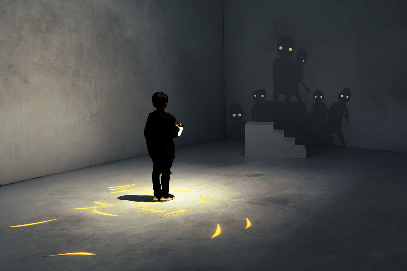 The room was installed without any openings not only for surround projection, but also for the beginning of the story. Shadow kids are stuck in this room. They are flat shadows, but they become three-dimensional as the story progresses. Fishes jump out of the plane of the floor and swim in the air. In this optical illusion, the viewer deeply engages with the kids who make eye contact and take a light from the viewer’s hand. Using the light, the kids draw new shades and three-dimensional space. Doors open on the wall, and the kids explore the space hidden behind the room. Between 2D and 3D, they draw a pleasant story that the optical illusion creates.